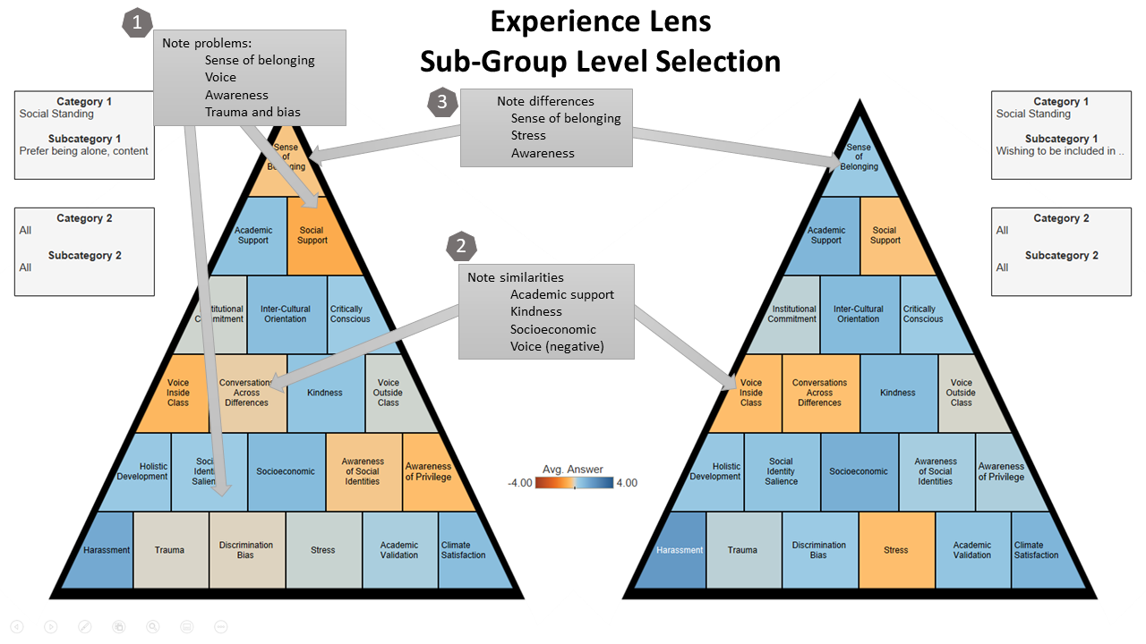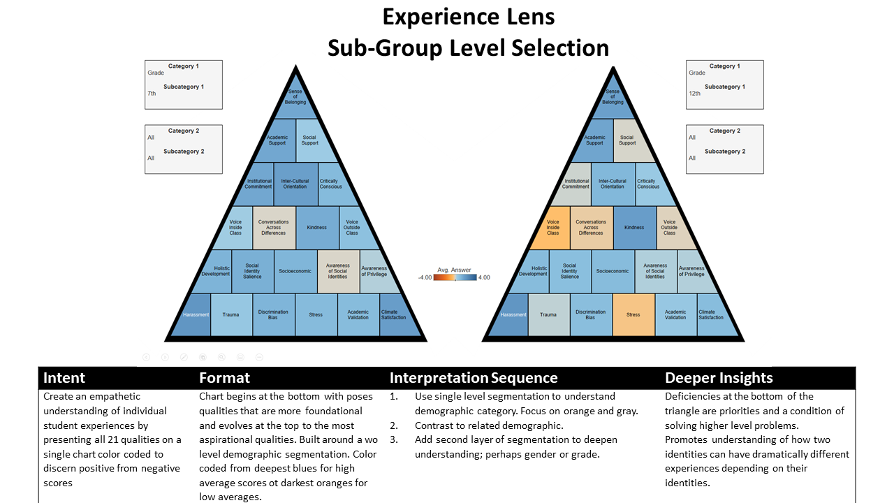 Users apply the Experience Lens construct to find specific quality dimensions impacting each identity by changing selections of subcategories within a demographic. Additionally, the tool contrasts the differences between two students as they experience the school from distinct identities.