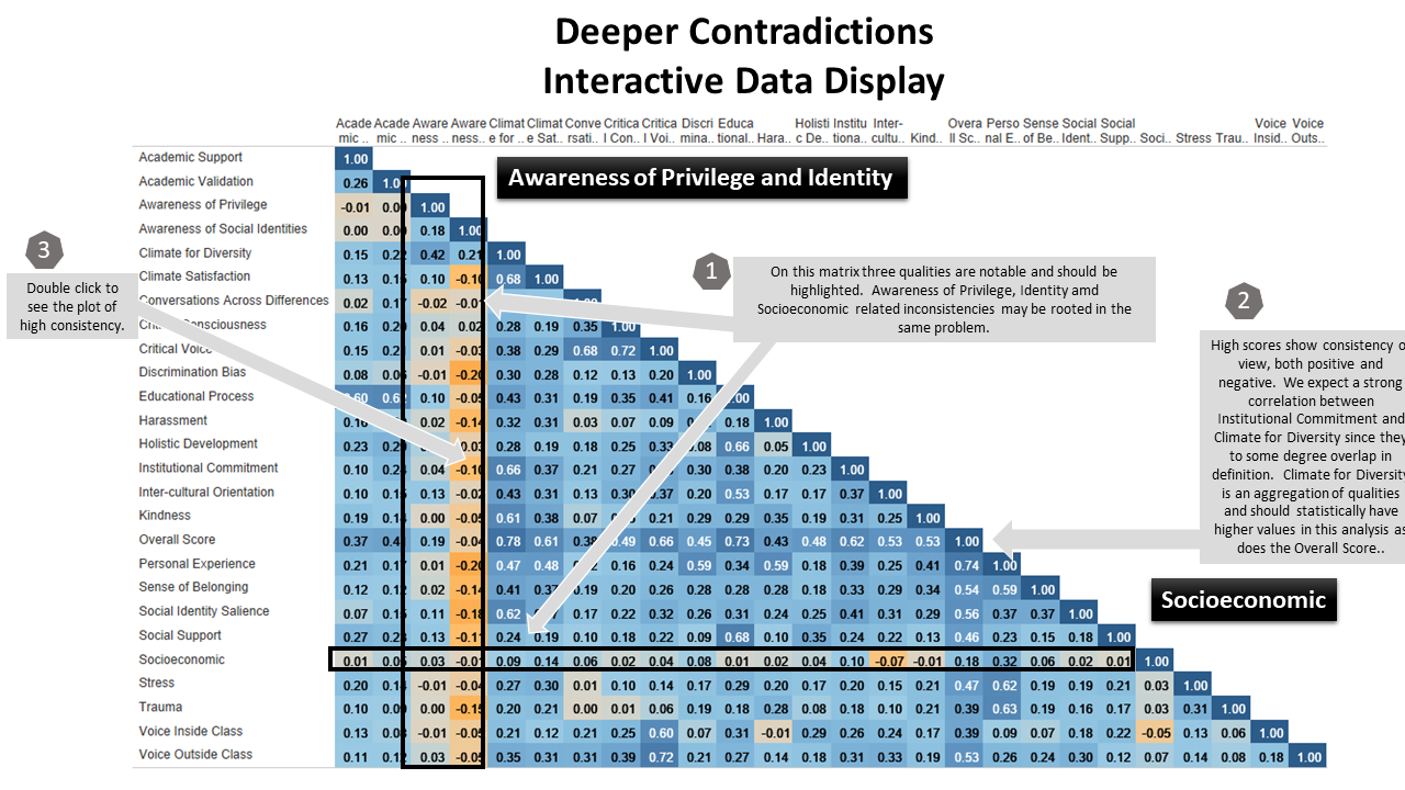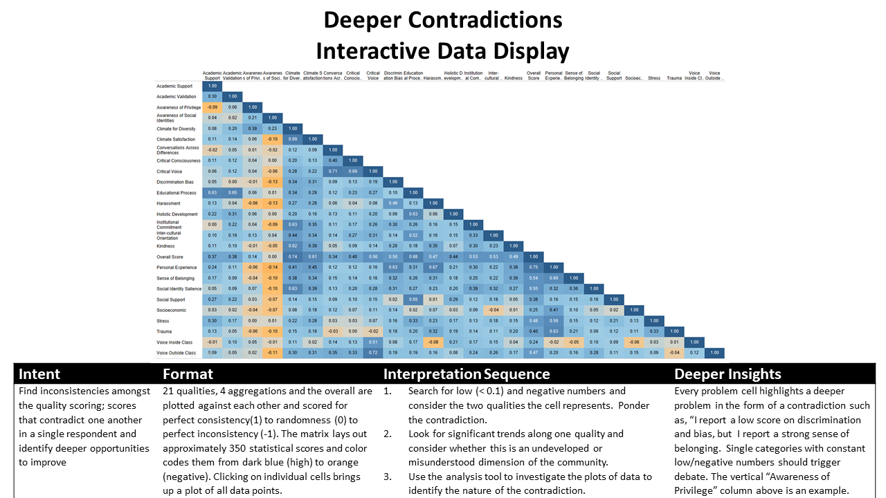 In the 21-quality survey, there are 210 paired quality relationships. The analytical package uses a tool called Deeper Contradictions to correlate the 210 relationships and produce a graphic that quantifies and color-codes the consistent or contrasting nature of each relationship. This allows us to both judge consistent pairs versus expectations, as well as find contradictory relationships.