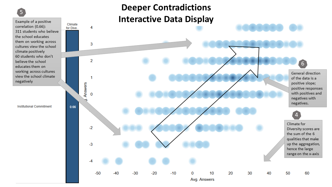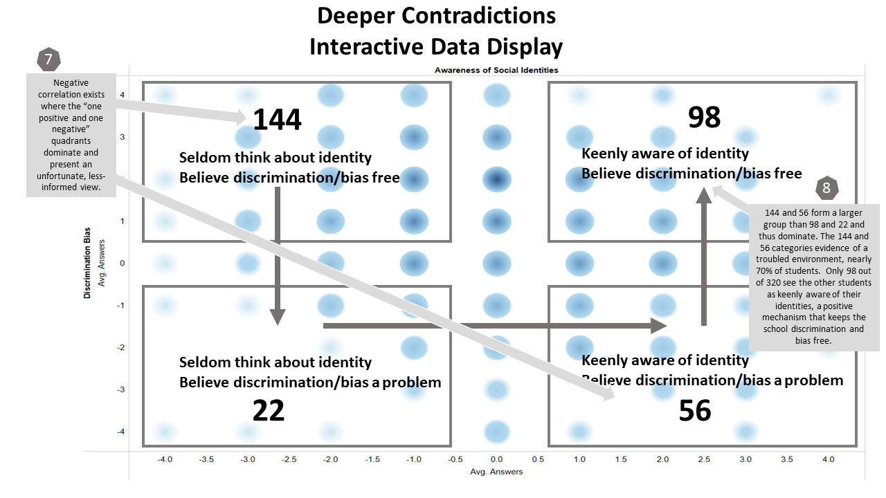 Since this is an advanced analytic and difficult to comprehend, the Deeper Contradictions tool provides a drill down that allows you to examine any pair of qualities by plotting all the student answers. This tool counts the students whose scores land in each of the four quadrants. This visual furthers understanding and helps interpret which of the two conflicting quadrants (Quality 1 Positive and Quality 2 Negative or vice versa) drives the “negative correlation” or in other words, the contradiction.