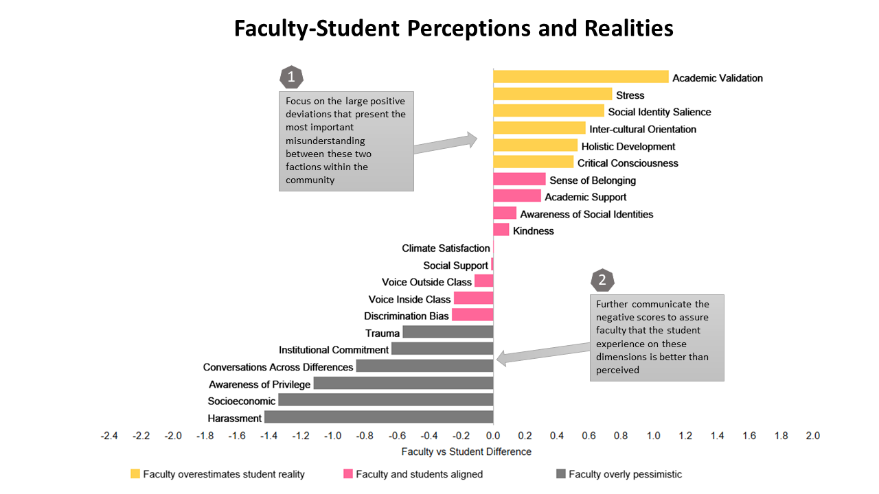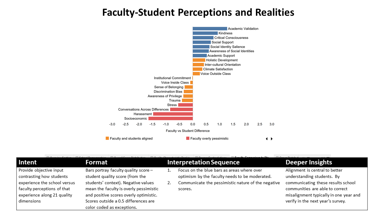 A related analysis of alignment focuses on the “faculty perceptions of the student experience” contrasted to the “student realities” defined by the student survey. To study these differences, the analytical tool plots the difference between the faculty and student scores for each quality. The results are sorted and placed in three tiers, qualities where faculty perceptions are overly pessimistic or optimistic and where they are aligned.
